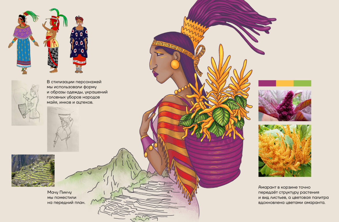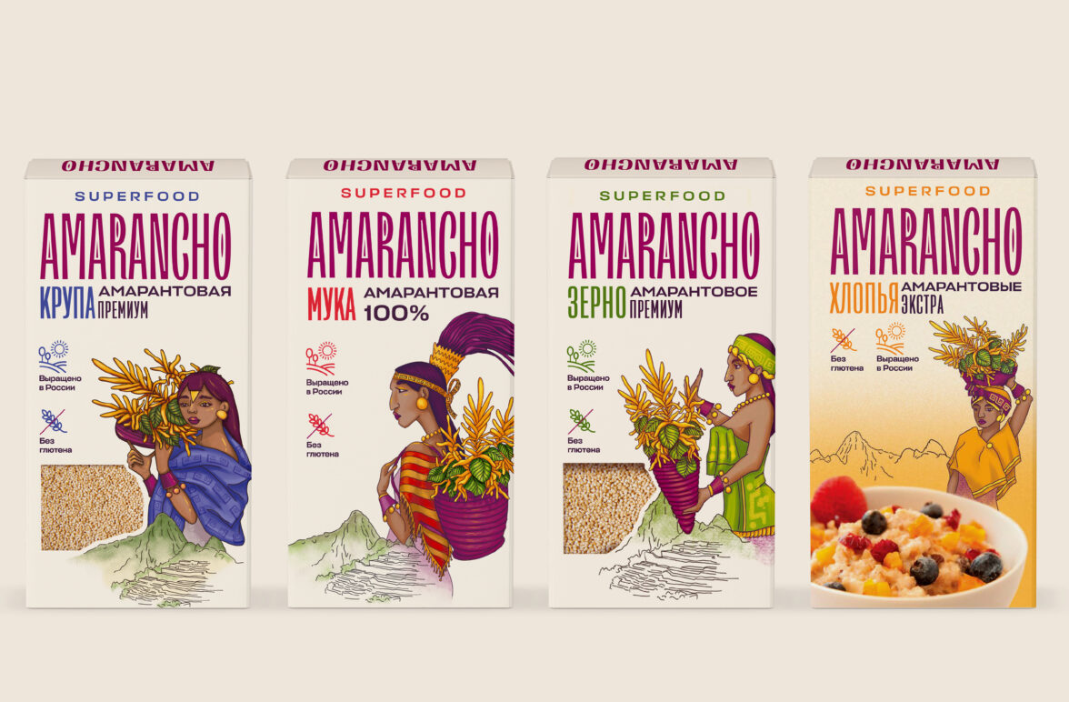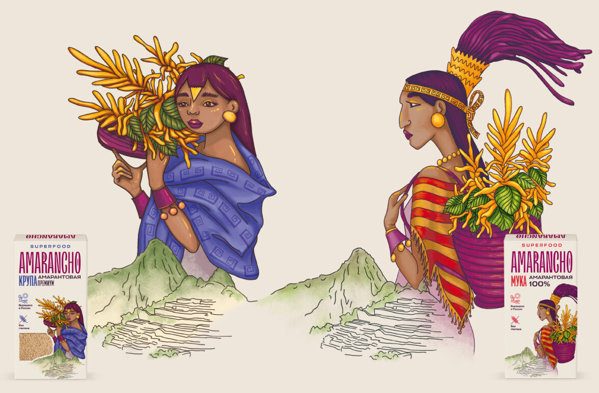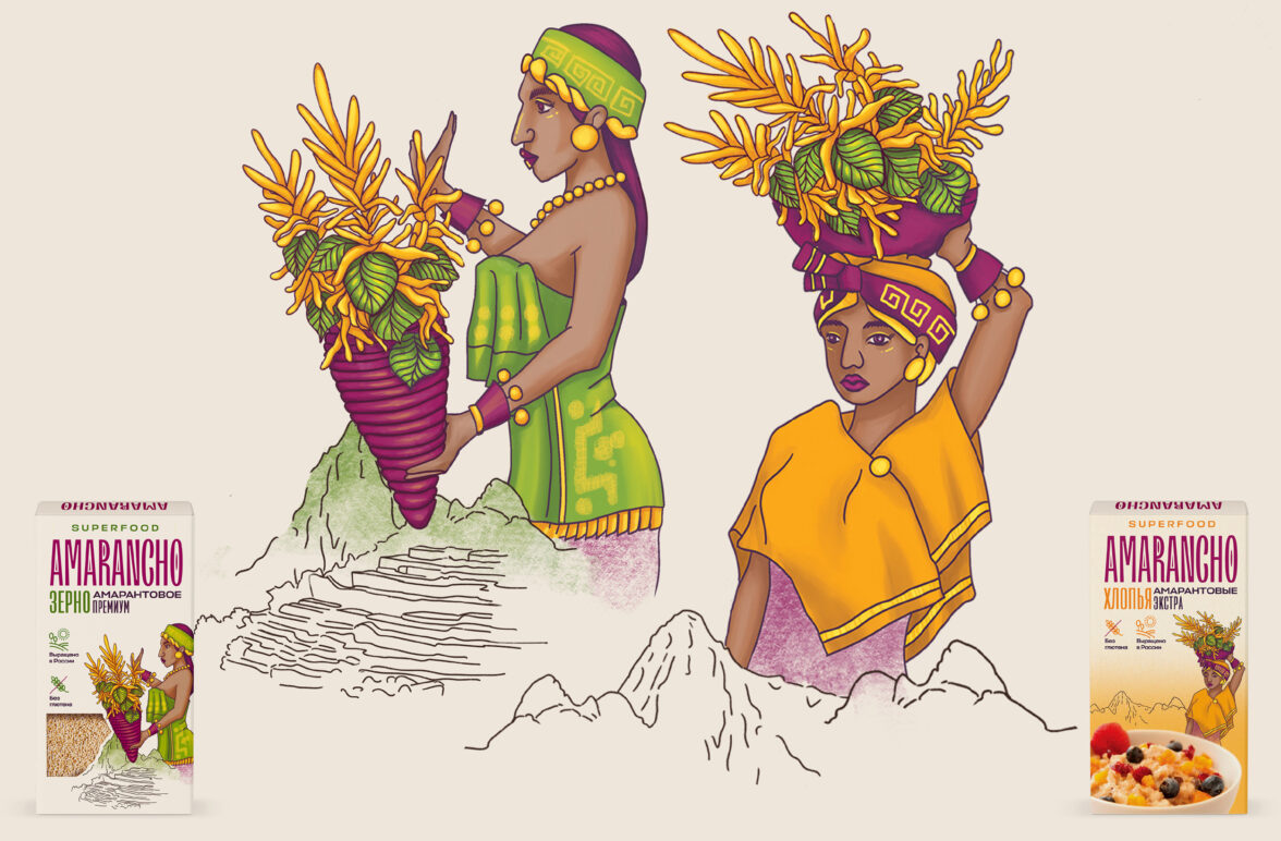 Для каждого из четырёх продуктов линейки – крупы, зерна, муки и хлопьев – нарисовали иллюстрации. Они ассоциируются с народами, первыми открывшими амарант в древние времена – ацтеками, майя и инками. Это изображение персонажей в традиционной одежде, украшениях и головных уборах цивилизаций Древней Америки.