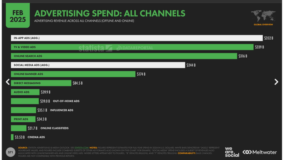 Согласно отчёту Digital 2025, реклама в мобильных приложениях занимает значительное место в digital-экосистеме. Она эффективно решает задачи по привлечению новой аудитории и повышению лояльности.