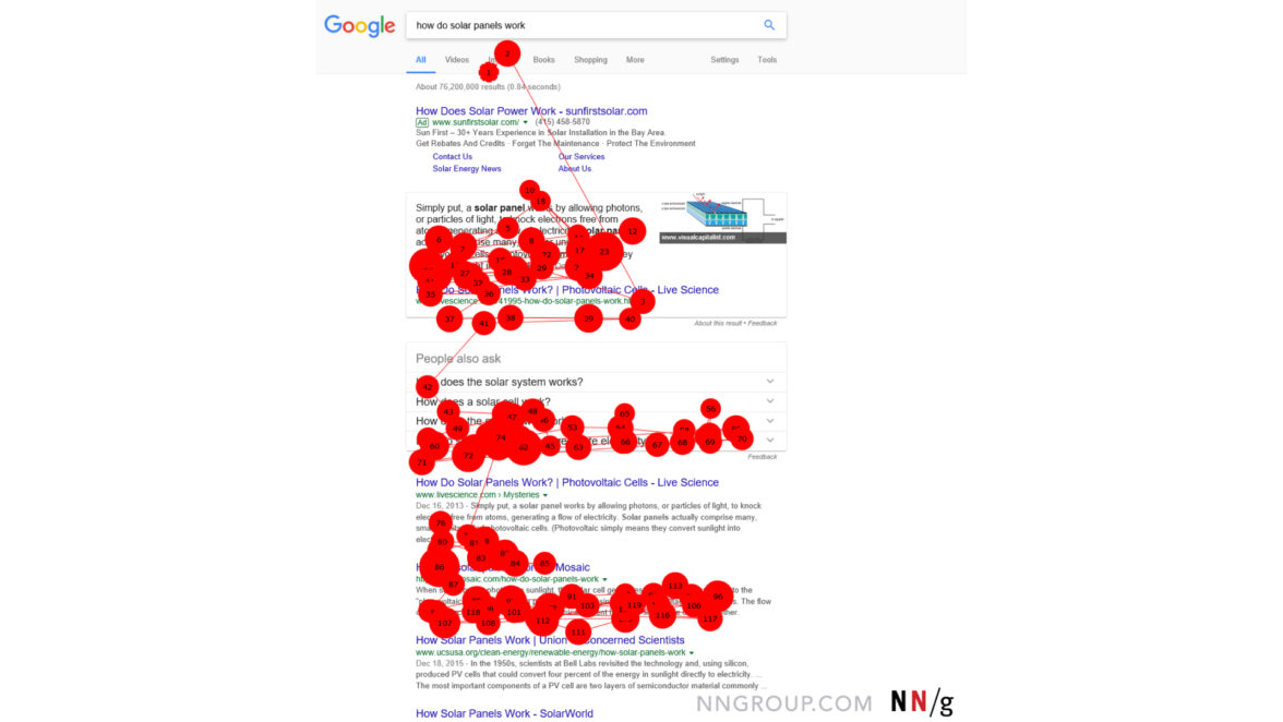 Nielsen Norman Group отследила движение глаз пользователя по результатам поисковой выдачи Google. Красные точки показывают, где зафиксировался взгляд, а линии — перемещения