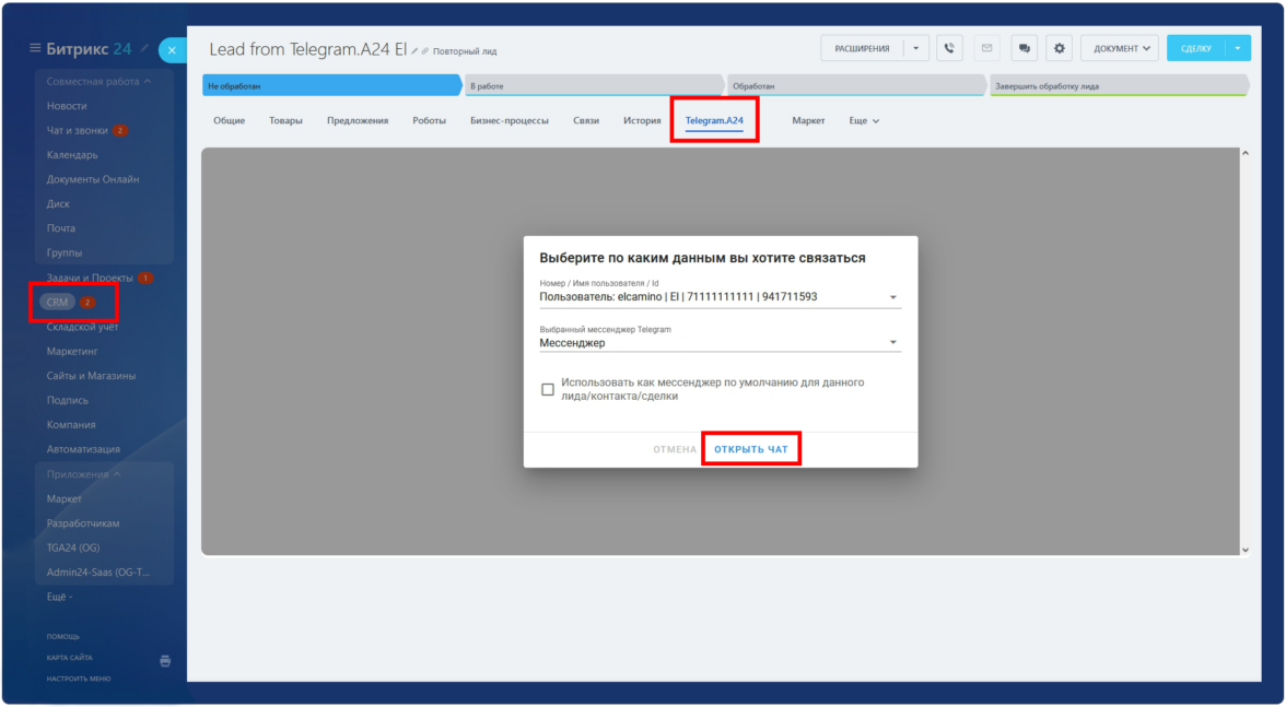 Чтобы перейти в чат таким способом, в разделе CRM откройте карточку клиента, перейдите во вкладку Telegram.A24. Далее выберите, по каким данным хотите связаться, и нажмите «Открыть чат».