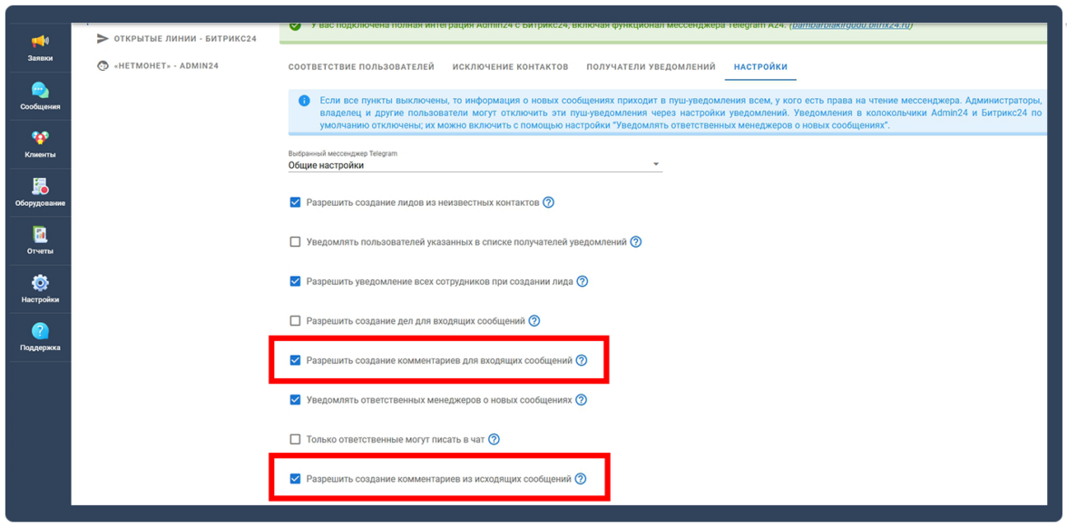 Настройка позволяет автоматически сохранять входящие и/или исходящие сообщения из чата в виде комментариев в карточку CRM: