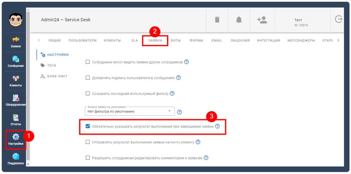 Чтобы появлялась возможность добавлять комментарий при завершении задачи, перейдите в «Настройки» → «Заявки» и поставьте галочку в пункте «Обязательно указывать результат выполнения при завершении заявки».