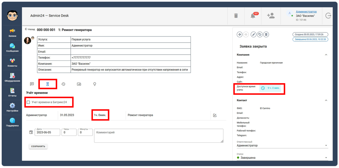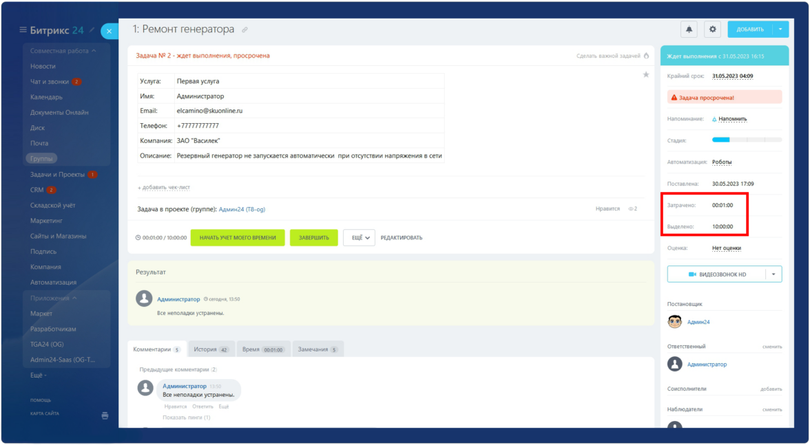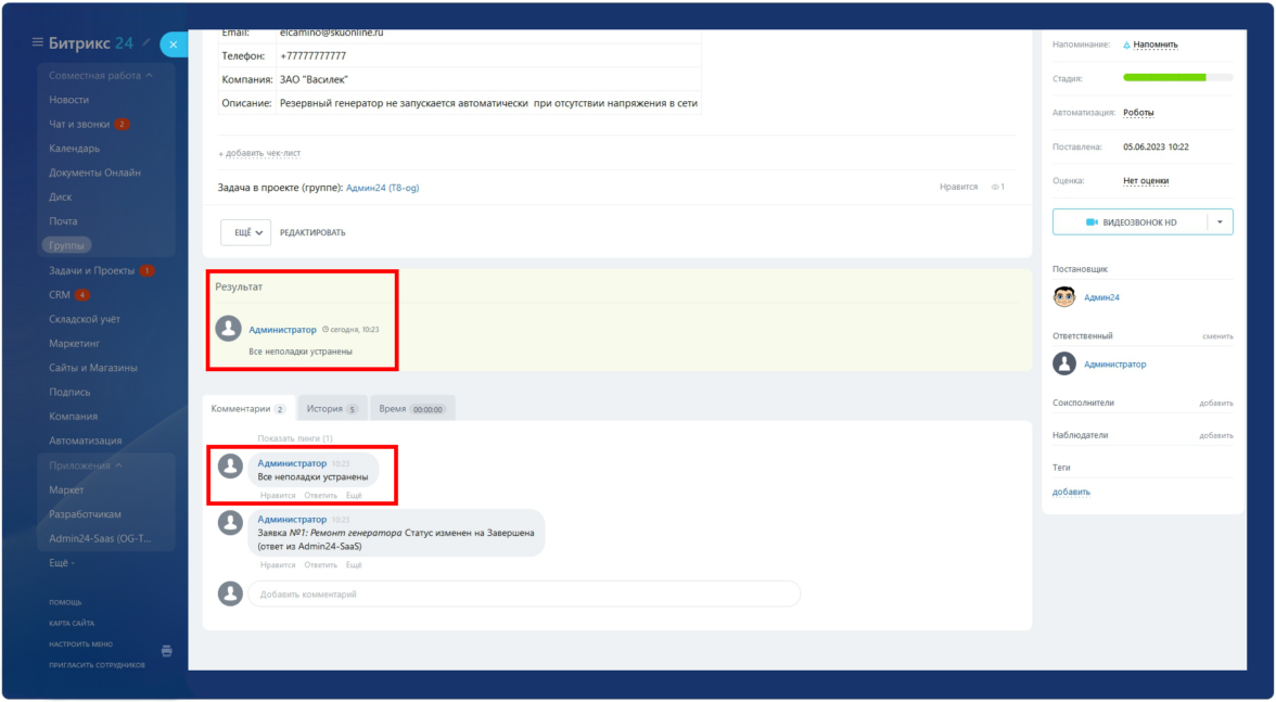 Отметим, что если вы изначально укажите результат о завершении заявки в Битрикс24 и зафиксируете его как результат работы, он также появится в виде комментария в Admin24.