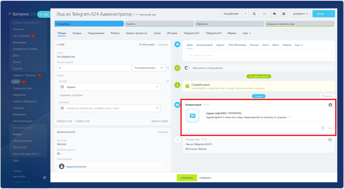 Теперь при завершении заявки в Admin24 информация о результате будет отображаться и в Битрикс24.
