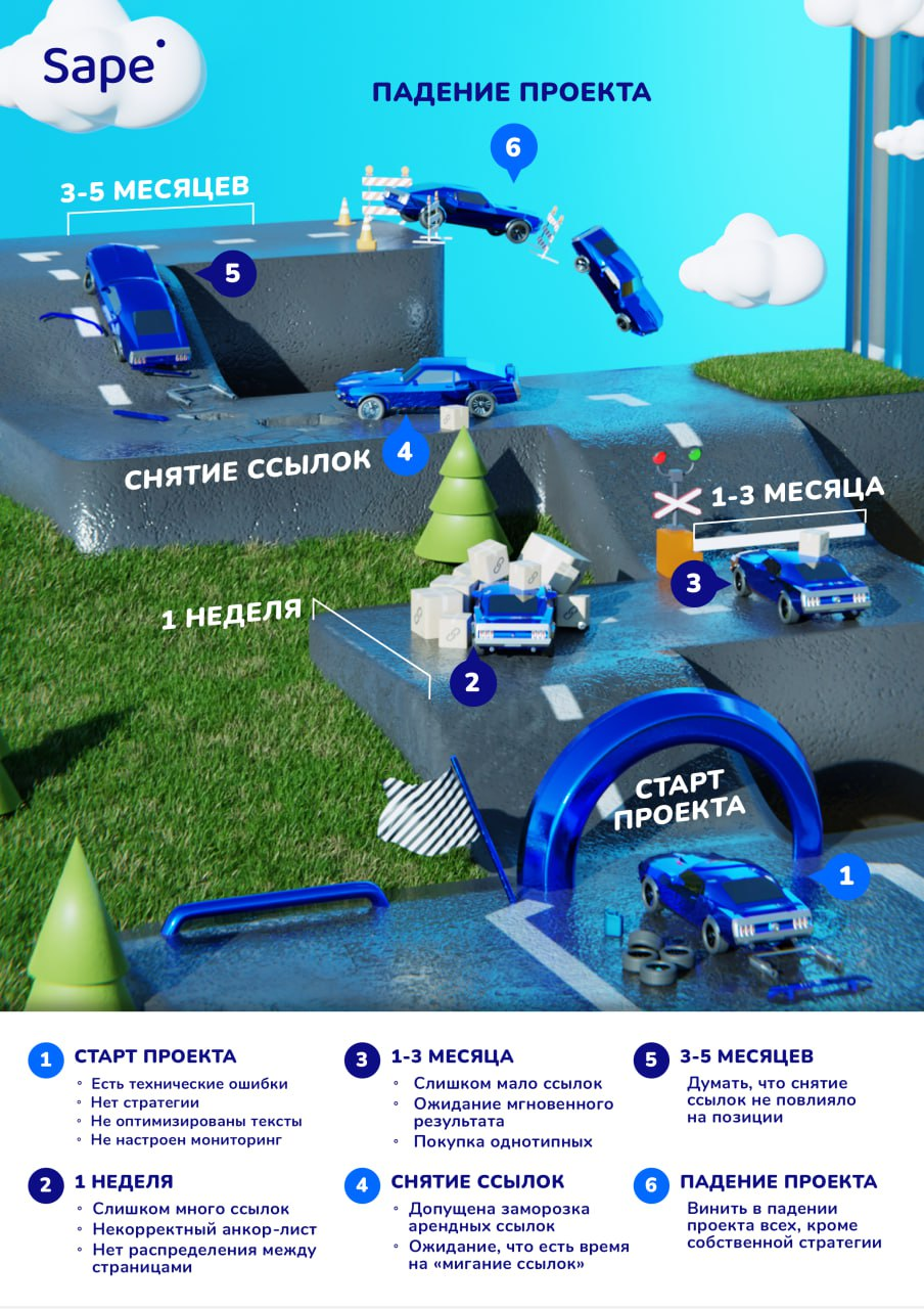 При продвижении сайта важно иметь в виду ряд нюансов, поскольку есть риск совершить ошибки, каждая из которых способна негативно повлиять на развитие проекта. Так, на инфографике ниже можно увидеть, к чему приводит некорректная работа со ссылками в долгосрочной перспективе: