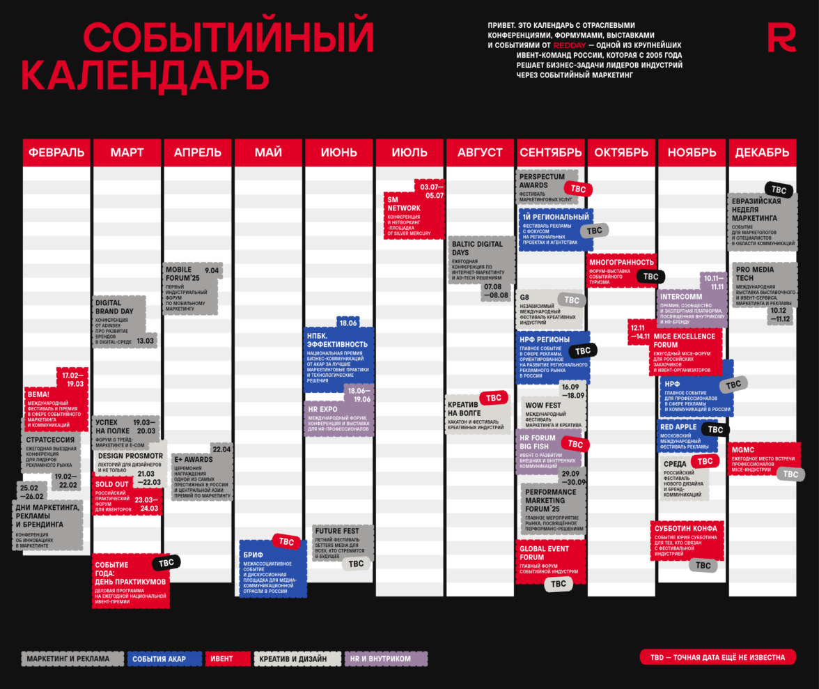 Мы знаем, как важно оставаться в контексте рынка, чтобы создавать эффективные коммуникации как для клиентов, так и для собственного бренда компании. Поэтому каждый год начинаем собирать внутренний календарь, где отмечаем наиболее интересные и актуальные отраслевые мероприятия. Решили поделиться подборкой и с вами.