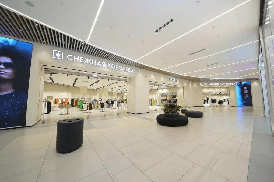 Карнизы, зеркала и пуфики в примерочных имеют плавные линии.