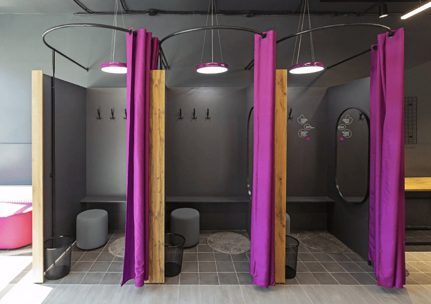 Внутри примерочных стены выдержаны в тёмном тоне. Для распаковки крупных товаров и проверки электроники есть отдельный стол со всем необходимым. Люстра и шторы немного напоминают богемный бордель, но инфографика и паттерн смягчает это впечатление.