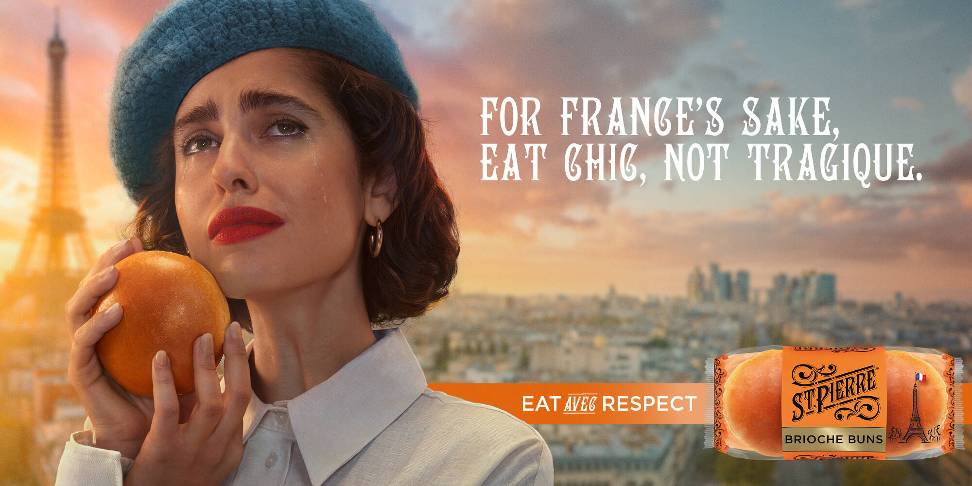 Франкобулочники из St. Pierre решили напомнить, что еда — это культ, и запустили рекламную кампанию «Eat avec respect» (ешь с уважением). В рекламном ролике, действие которого происходит в утреннем французском кафе, разыгрывается трагедия. Посетители заведения узнают, как британцы обращаются со вторым после круассана Святым Граалем французских хлебопеков – булочкой бриошь. Вместо того, чтобы в аккуратно разренную булочку ювелирно положить салат из свежего омара с зеленью, варвары кидают на нее сыр из супермаркета, пережаренный кебаб с улицы и заливают кетчупом. Все в кафе, включая собак, теледиктора и картину на стене, в ужасе.