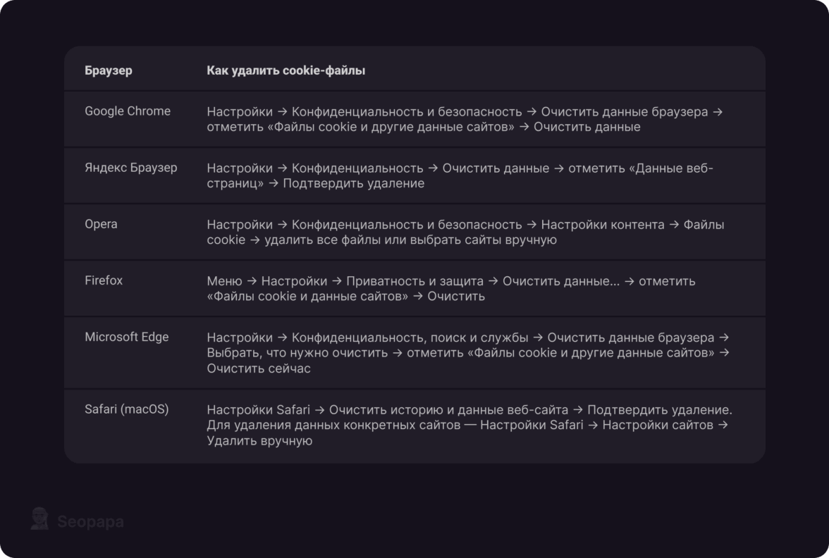 Chrome: Настройки → Конфиденциальность и безопасность → Очистить данные браузера → «Файлы cookie…» → Очистить.