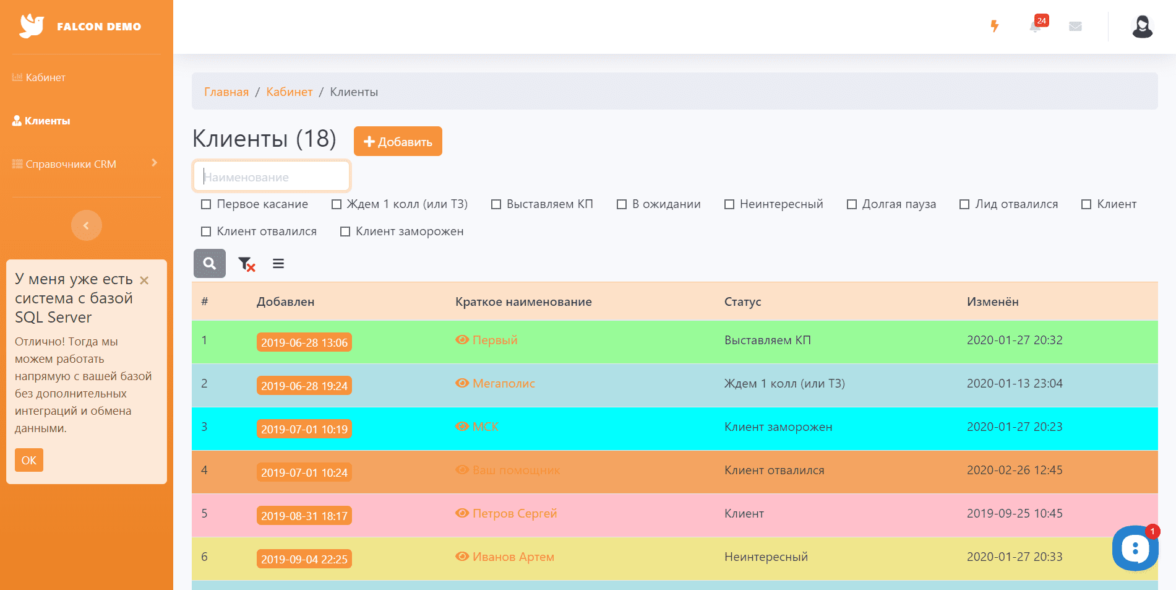 База клиентов. Таблица всех клиентов, с ограничением доступа по менеджерам. В ней есть возможность фильтрации по статусам и поиск по названию, цветовое кодирование по статусу клиента.