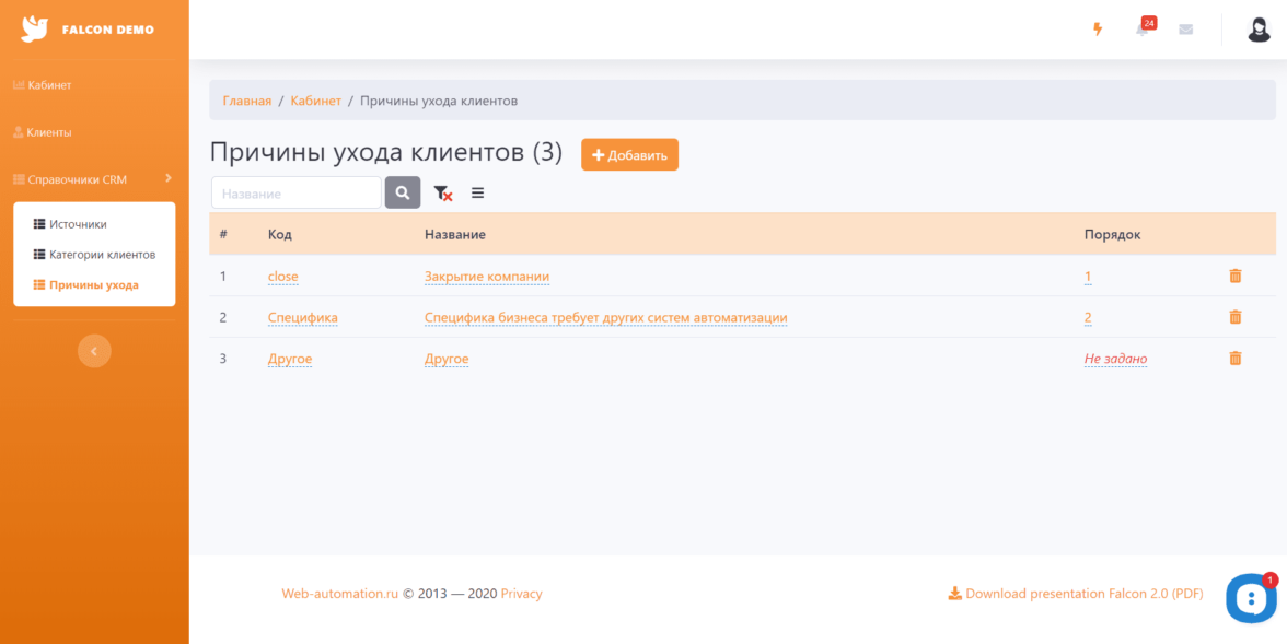 Редактирование справочников. По сути, это служебная страница, которая позволяет управлять основными справочниками в CRM — Источники, Категории клиентов, Причины ухода и т.д.