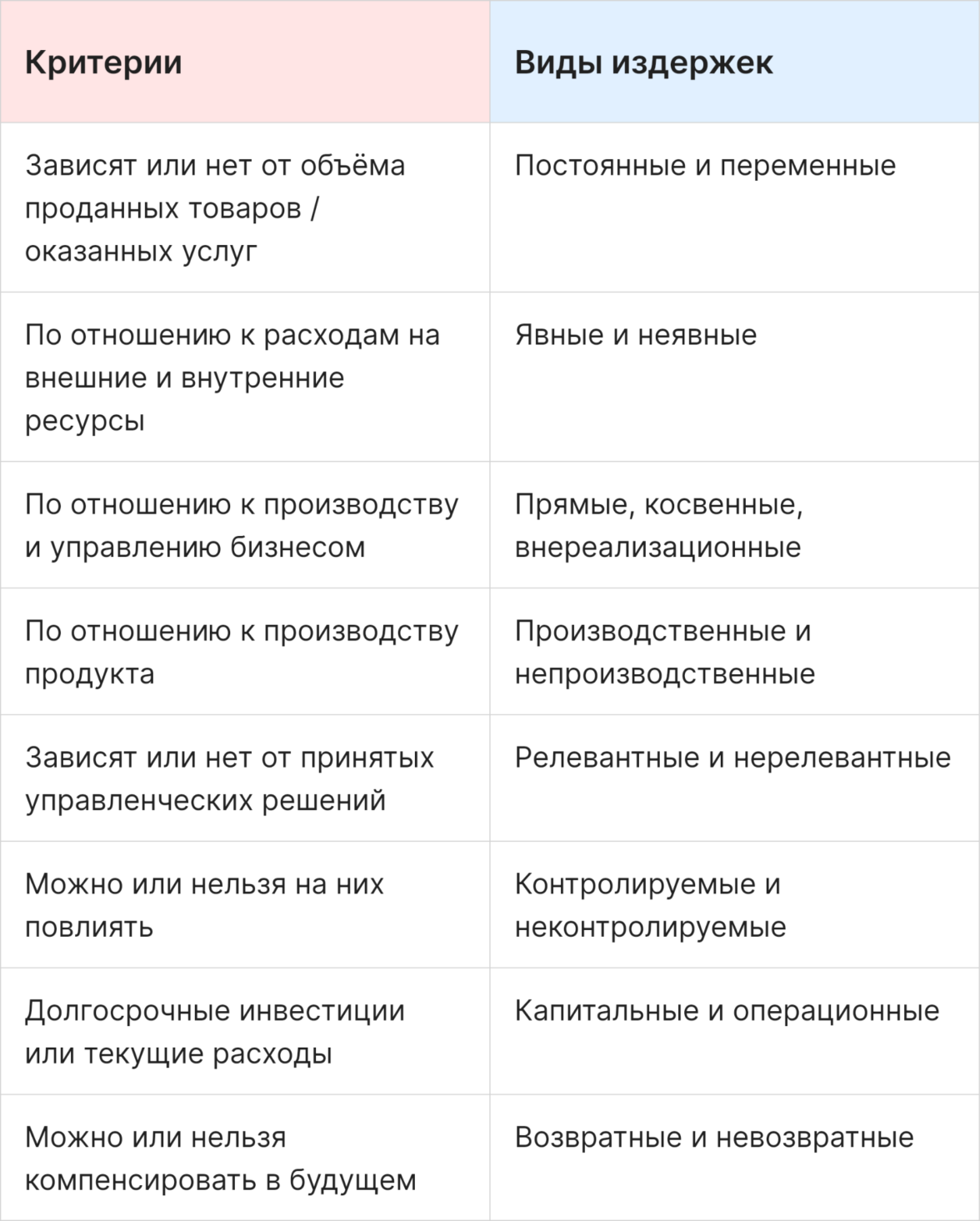 Все распространенные виды издержек собрали в таблицу ниже, а далее подробно остановимся на самых важных для бизнеса.