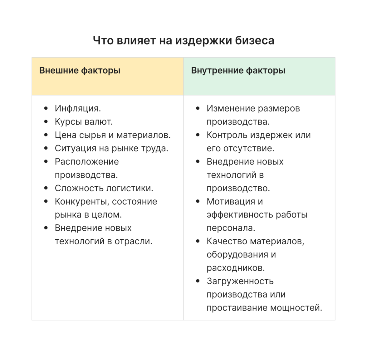 Издержки в основном зависят от эффективности производства, рационального использования имеющихся ресурсов, компетентности управляющих и мотивированности сотрудников. В частности, важно обращать внимание на нагрузку: если ее мало, часть работников или оборудования будет простаивать, повышая издержки. Если же слишком много, есть риск увеличения процента брака из-за торопливости, поломок оборудования, выгорания работников из-за тяжелых условий труда.