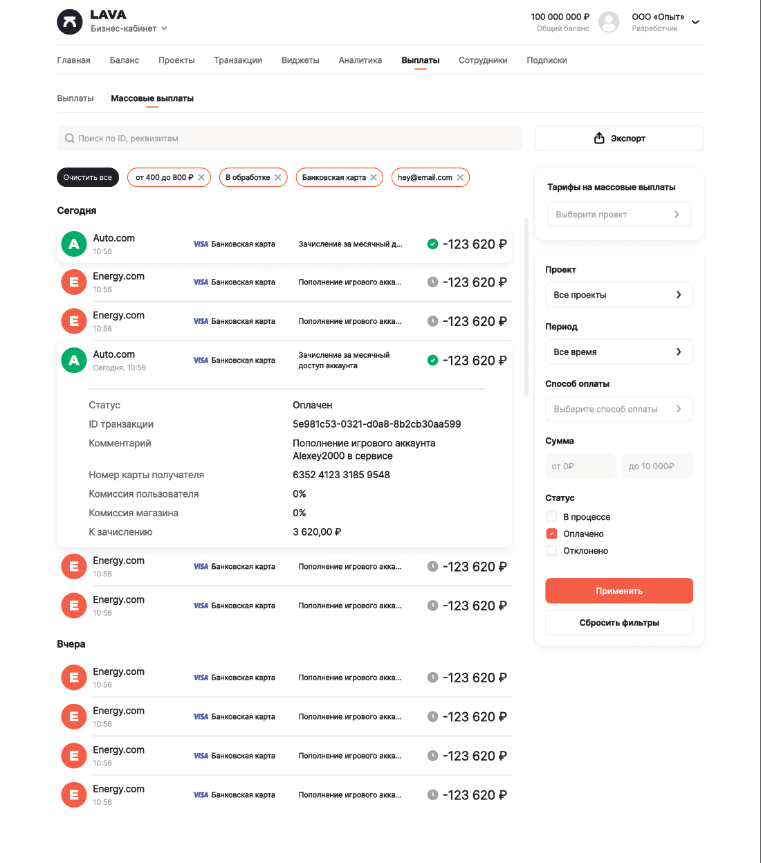 Гибкость и контроль. Lava предоставляет полную отчетность и возможность отслеживания каждой транзакции, что упрощает финансовый контроль и управление платежами.