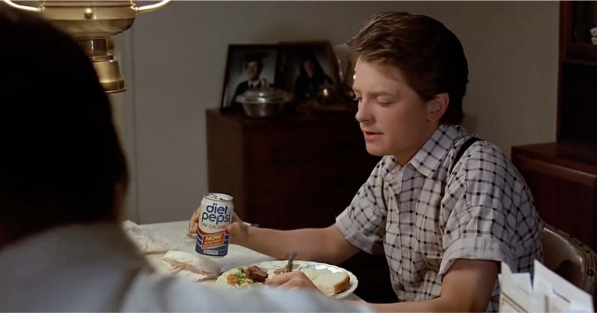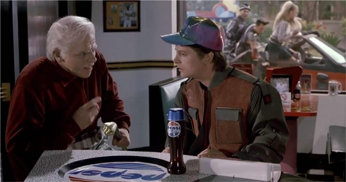 В обоих фильмах герои пьют напиток Pepsi с дизайном из разных эпох.