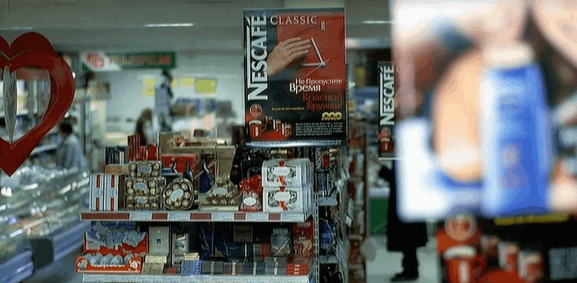 А супермаркет завешан баннерами с кофе Nescafe, который, конечно, покупает героиня.