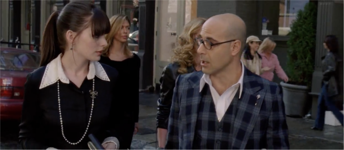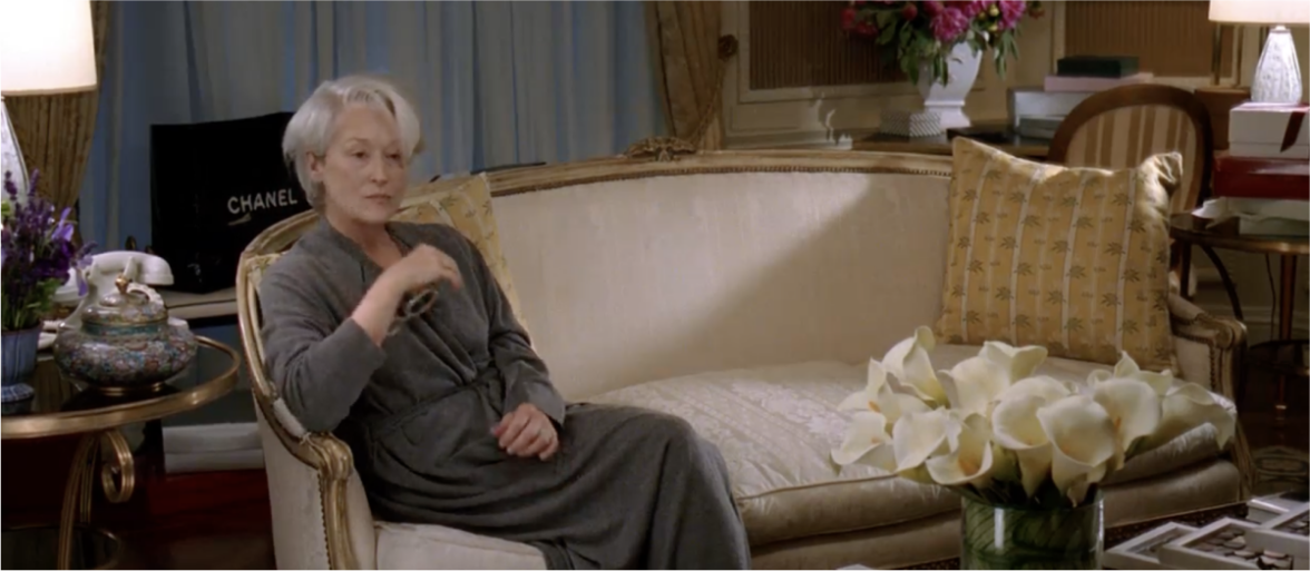 Конечно, в фильме про мир моды появляется один из самых известных люксовых брендов. Героиня Энн Хэтэуэй преображается и носит украшения Chanel, а Миранде модный дом вручает подарок, который мы видим у неё за спиной в пакете.