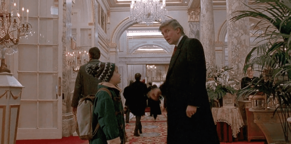 Здесь в кадре даже есть сам владелец гостиницы Дональд Трамп, у которого Кевин спрашивает, куда ему идти.