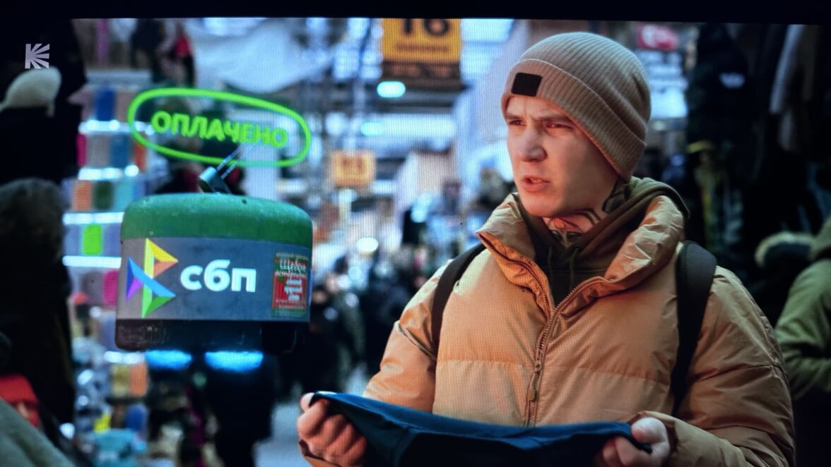 В сериале «Кибердеревня», действие которого происходит в будущем, люди оплачивают покупки через небольших роботов с лого системы быстрых платежей «СБП».