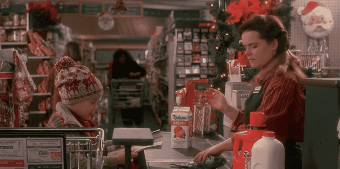 А в магазине юный герой покупает сок Tropicana и стиральный порошок Tide вместе с другими вещами.