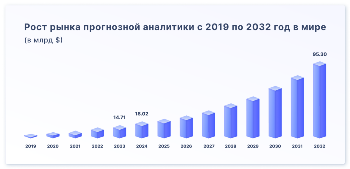 В 2023 году рынок прогнозной аналитики достигал 14,71 миллиард долларов, а к 2032 году эта цифра вырастет до 95 миллиардов. Программное обеспечение для предсказания будущих событий на основе данных внедряется в сферы бизнеса и становится частью нашей жизни.