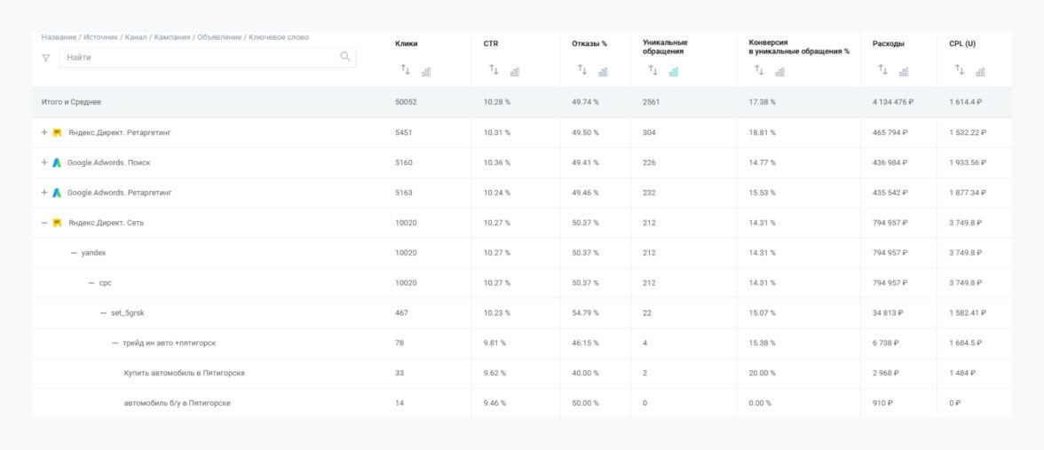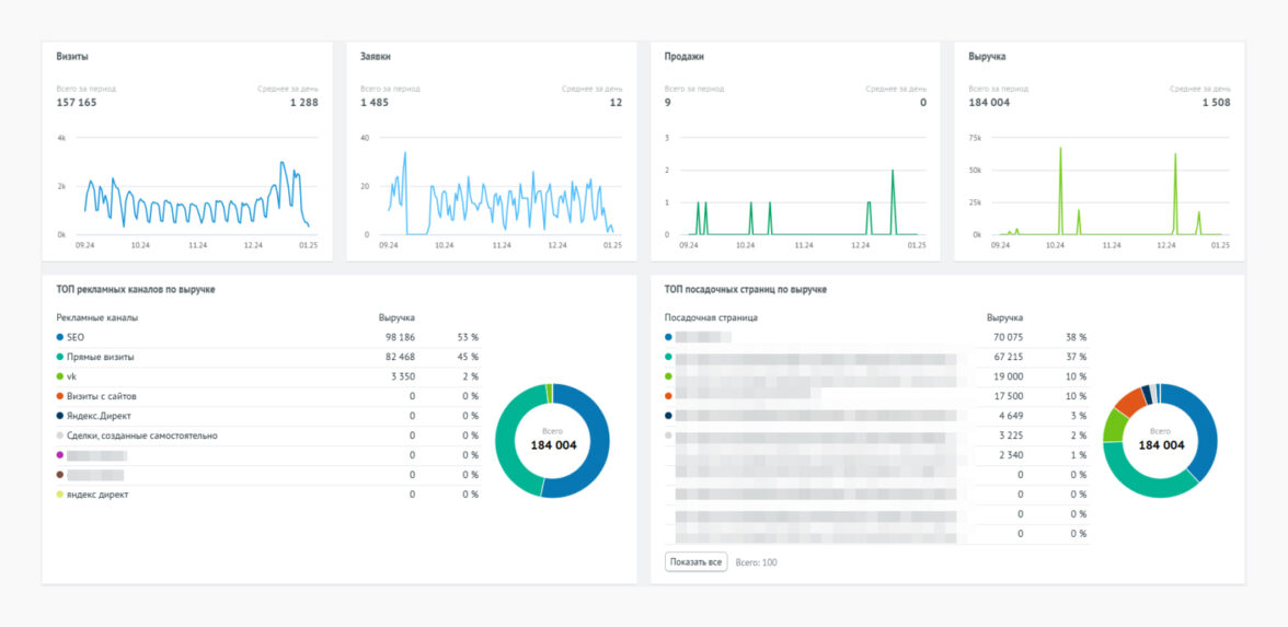 Эффективность рекламных каналов. Например, какие кампании в РСЯ приносят больше всего заявок и продаж.