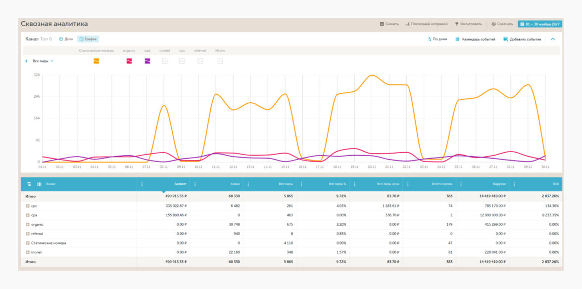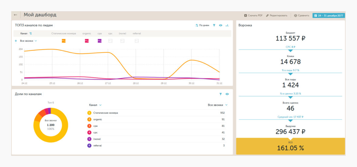 Определяет, какие рекламные каналы приносят прибыль. Вы увидите не только количество заявок, но и сумму сделок, окупаемость рекламы.