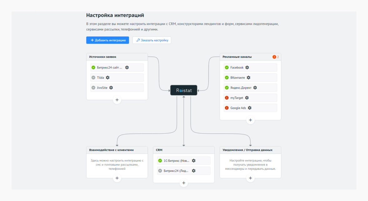 25+ готовых интеграций (с Яндекс.Директ, Google Ads, ВКонтакте, Telegram, Bitrix24, amoCRM и другими).