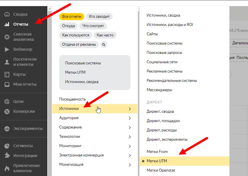 Посмотреть статистику переходов по UTM-меткам в Яндекс.Метрике можно следующим образом: «Стандартные отчёты» → «Источники» → «Метки UTM».