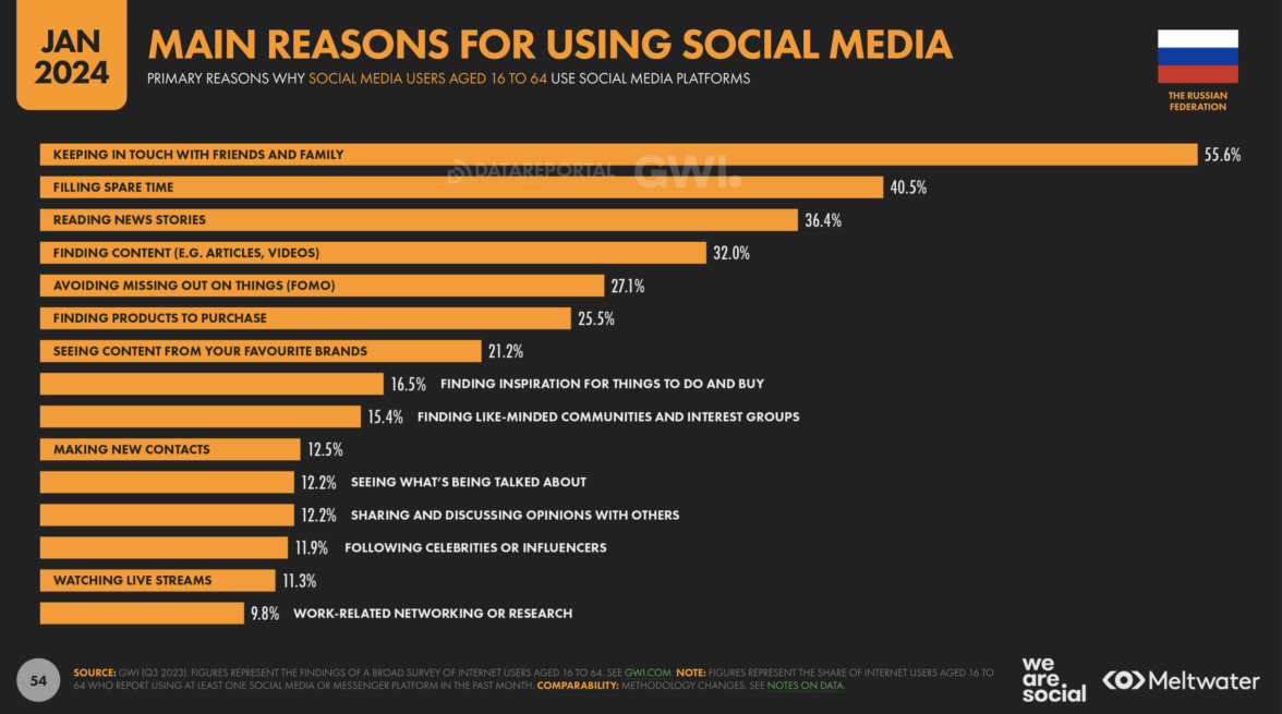 Жители нашей страны используют эти площадки для общения с родными и друзьями, отдыха, отслеживания новостей, чтения статей и просмотра видео, а также для поиска товаров и услуг и изучения контента от любимых брендов.