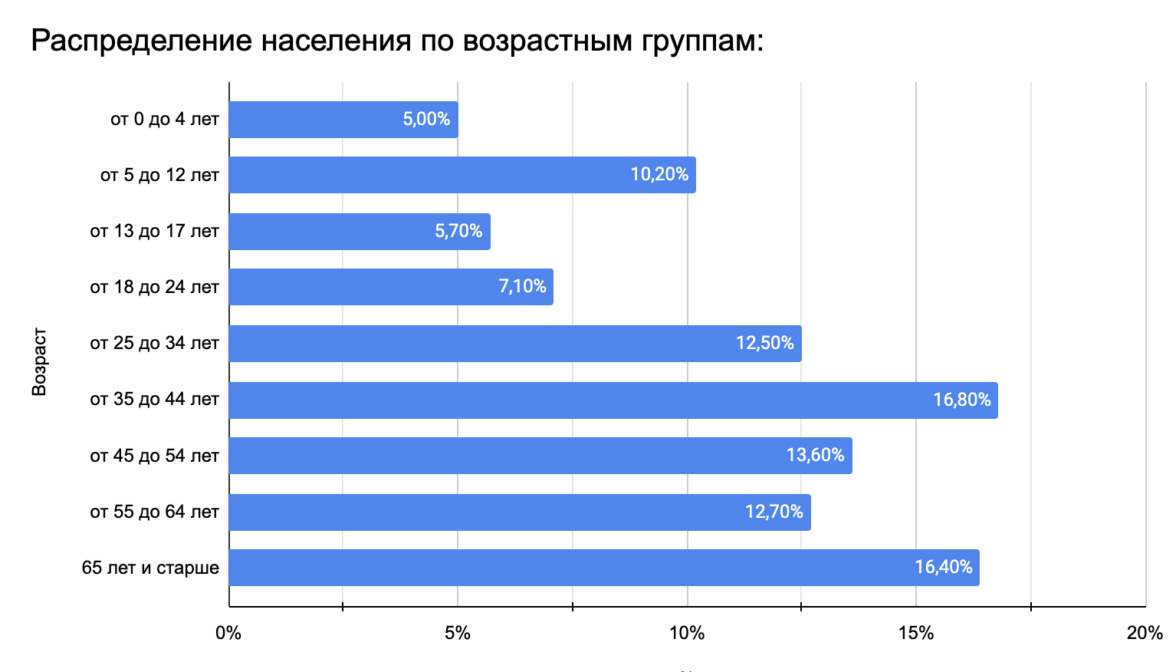 Средний возраст жителя России — 39–40 лет. Большую часть населения составляют граждане в возрасте от 35 до 44 лет и пожилые люди старше 65 лет. Рождаемость в стране низкая, а также наблюдается провал в категории зумеров — молодежи от 13 до 24 лет. Так что большую часть аудитории составляют люди старше 35 лет.