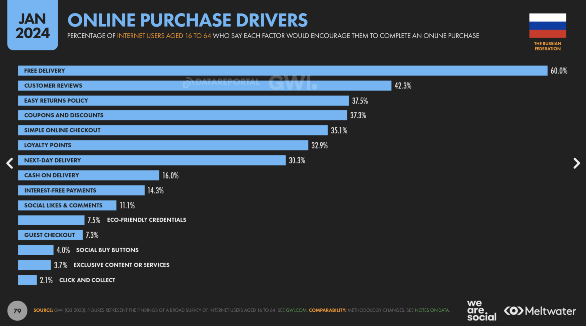 Клиенты отдают предпочтение брендам, которые осуществляют бесплатную доставку заказов. Данная опция стала главным драйвером покупок — на ее наличие обращают внимание 60% пользователей.