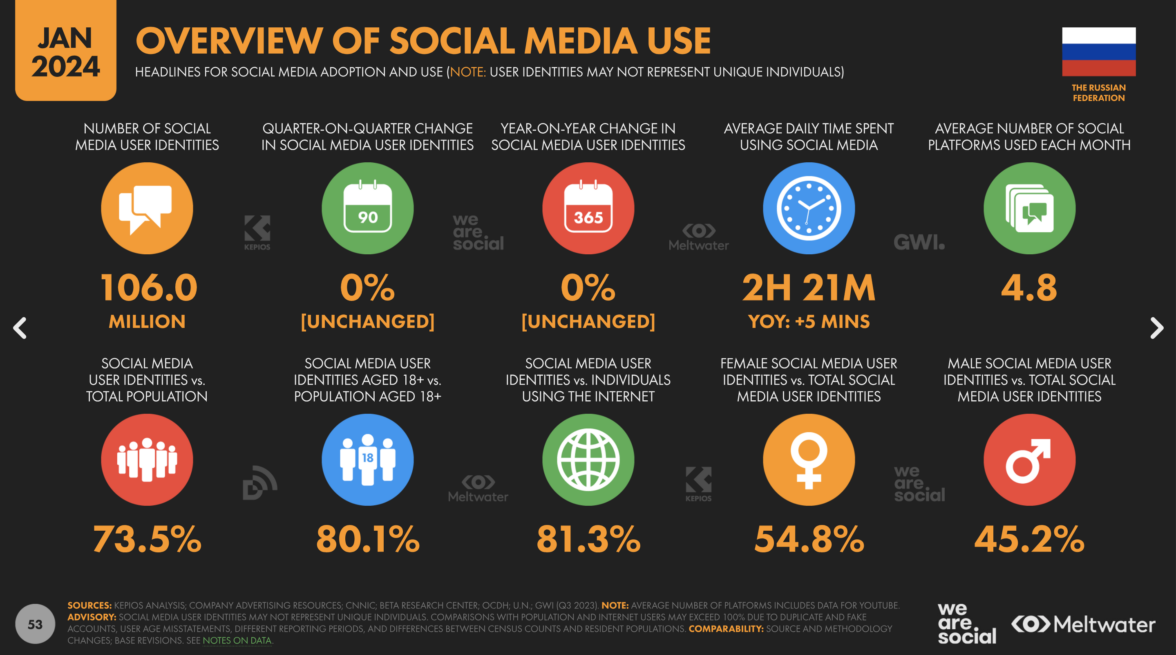 Больше половины населения России пользуется соцсетями и мессенджерами — это 106,6 млн человек. Ежедневно они проводят в диджитал каналах коммуникации не менее 2 часов 21 минуты и в течение месяца посещают примерно 5 разных интернет-площадок.