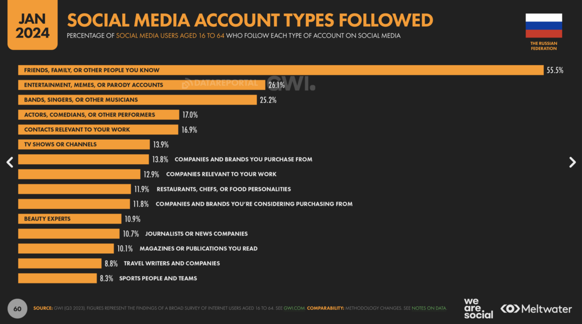 Чаще всего пользователи подписываются на знакомых, новостные аккаунты, развлекательные каналы, профили актеров, комиков и других артистов. 13,8% россиян следят за аккаунтами компаний, товарами и услугами которых уже пользуются. Ещё 11,8% фолловят бренды, у которых хотели бы что-то купить. Считаем, эти цифры — весомый аргумент, почему бизнес должен активно вести соцсети.