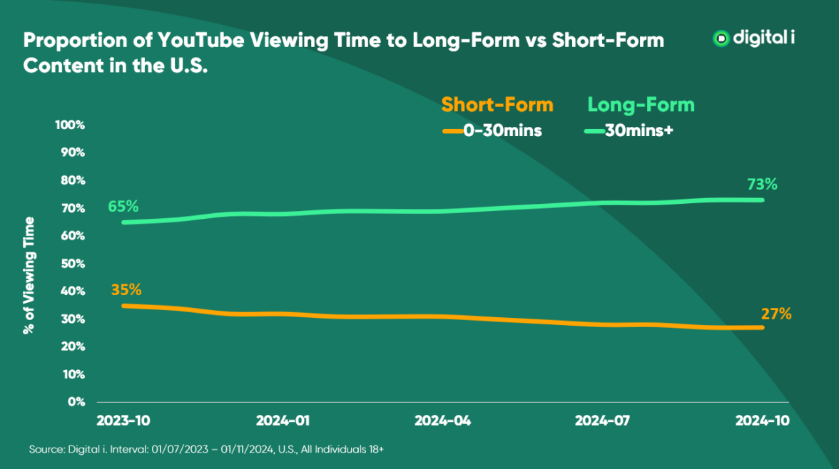 Американские пользователи YouTube в 2024 году увеличили потребление длинных видео. Время, которое американцы тратят на просмотр видео продолжительностью от 30 секунд, за год выросло на 8%. Сейчас 73% времени, которое жители США проводят в YouTube, приходится на длинные видео и лишь 27% на ролики продолжительностью до 30 секунд, выяснили аналитики Digital i. Абсолютных цифр они не приводят.