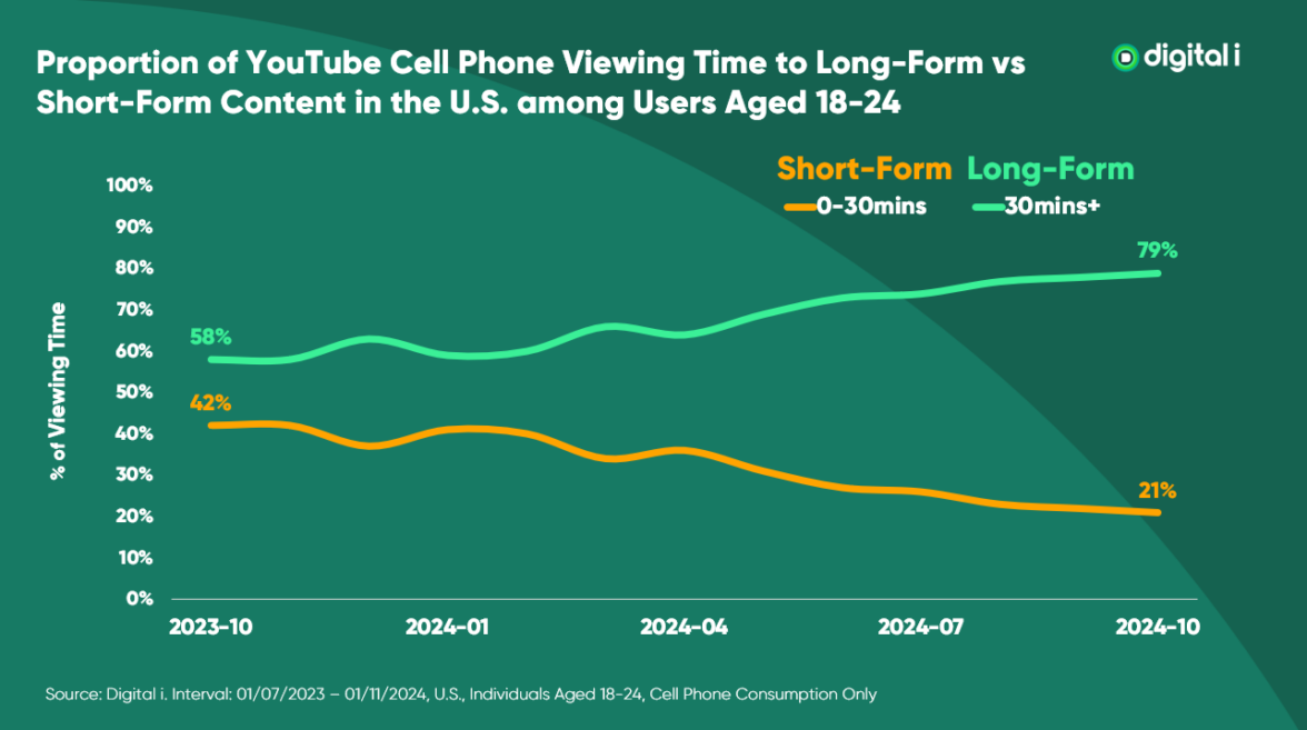 Именно молодежь является одним из основных драйверов потребления длинных видео. Доля просмотров длинных видео на YouTube у аудитории от 18 до 24 лет выросла с 58% в 2023 году до 79% в 2024-м, на 21 процентный пункт.