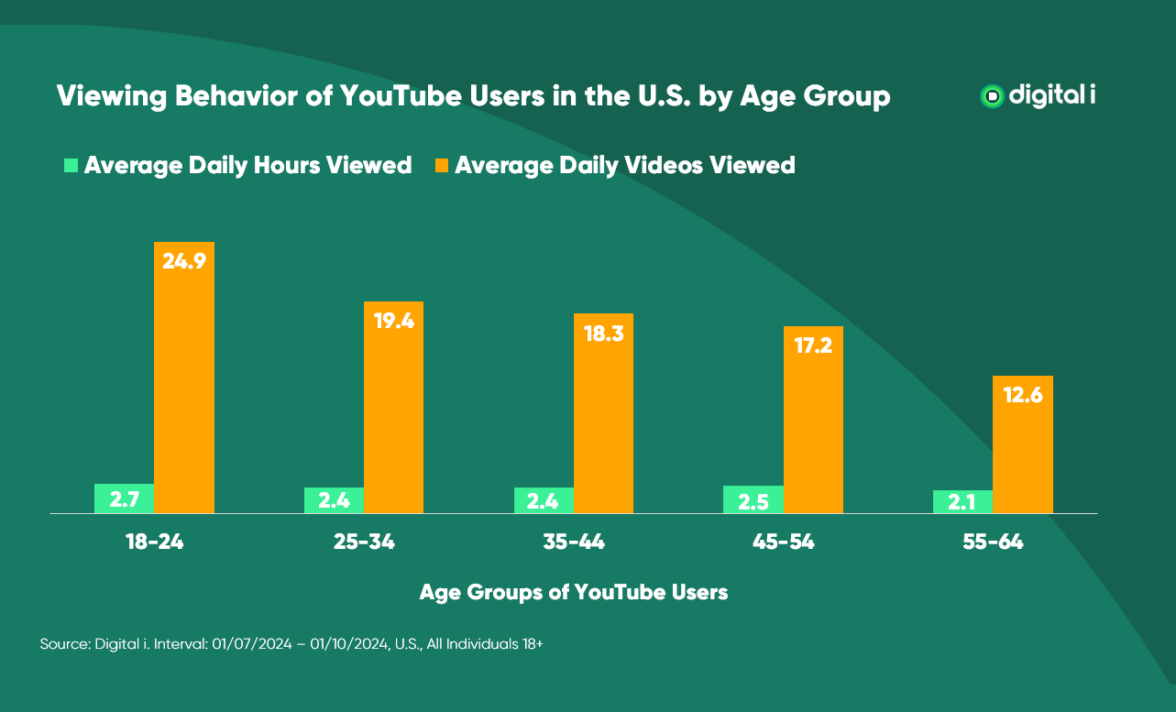 В период с июля по октябрь 2024 года эта аудитория проводила на YouTube в среднем 2,7 часа в день, просматривая около 25 видеороликов ежедневно.