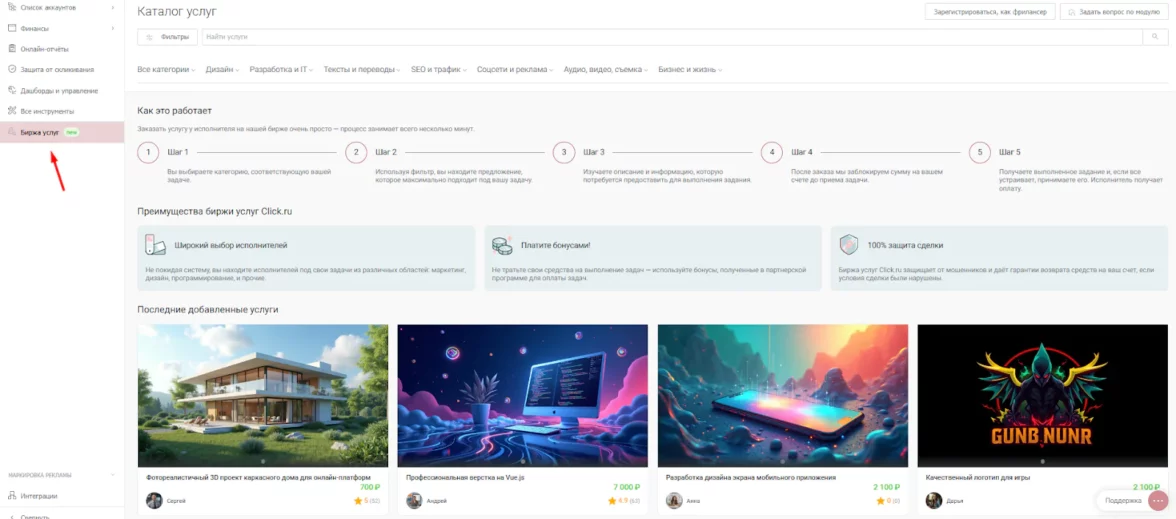 В сервисе click.ru работает «Биржа услуг» — площадка, где собраны предложения от проверенных специалистов из сферы digital-маркетинга. На ней можно быстро находить дизайнеров, разработчиков, копирайтеров и других экспертов и закрывать десятки задач без найма в штат.