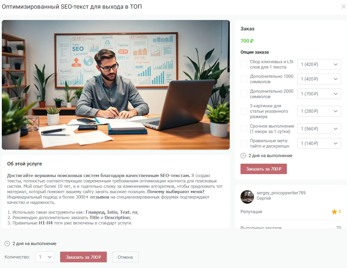 Удобный старт для новичков. Начинающие специалисты получают шанс быстрее набрать рейтинг: их карточка отображается в начале списка услуг внутри категории. Это помогает получить первые заказы и создает честную конкуренцию.
