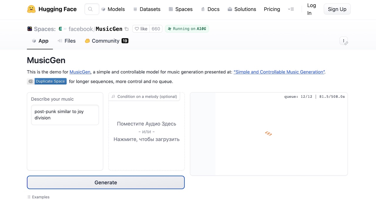 Корреспондент ADPASS протестировал музыкальный генератор в демоверсии на Hugging Face. Чтобы воспользоваться ей, нужно заполнить окно текстового запроса на английском, по желанию загрузить аудио-файл для референса и подождать в очереди от 80 до 800 секунд.