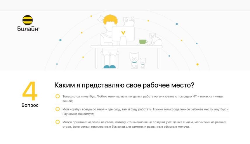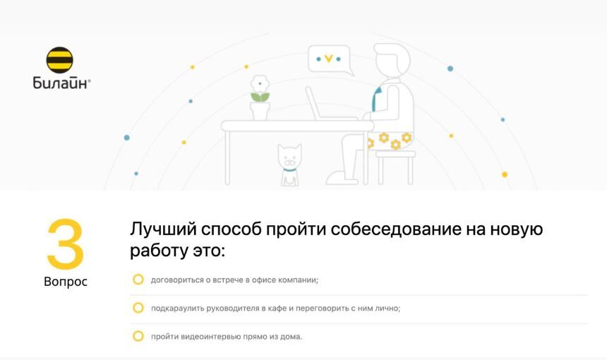 Я тогда горела желанием снять видео для проекта и подумала: «Смотреть ролик классно, но быть его активным участником куда круче». Интерактивное видео как HR-инструмент показалось мне отличным решением, билайну предложение тоже понравилось, и мы создали квест «Работа в билайн».