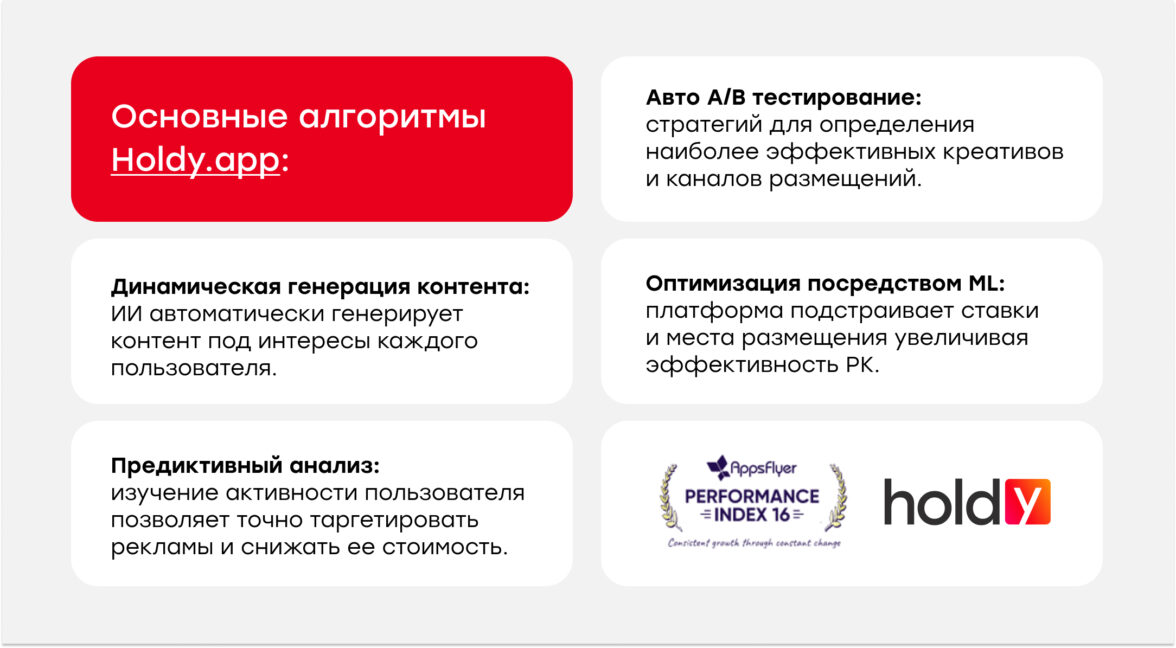 На примере нашей платформы Holdy. app можно увидеть, что такая эффективность достигается за счет персонализированного in-app ретаргетинга, алгоритмов ИИ и машинного обучения, обеспечивающих точный таргетинг и сегментацию. Именно это позволило нам попасть в топ-10 AppsFlyer Performance Index 2023 по ремаркетингу в Европе.