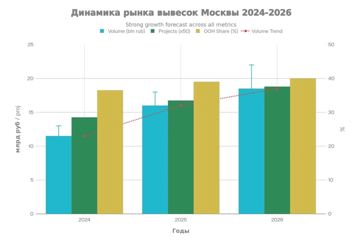 Эксперты ожидают умеренного подъема: рынок вывесок в Москве вырастет до 15–22 млрд рублей (+7–15%). Доля в OOH останется на уровне 38–42% при общем объеме 38–53 млрд рублей. Замедление связано с общим рынком рекламы (+15% по данным Okkam) и напором цифровой наружки (DOOH).Согласований проектов будет 900–980 (+10–15%). Около 30% из них будут “умные” гибриды с AR-метками, сенсорами и связкой с приложениями для геотаргетинга. А цены на производство подскочат на 10–15%.