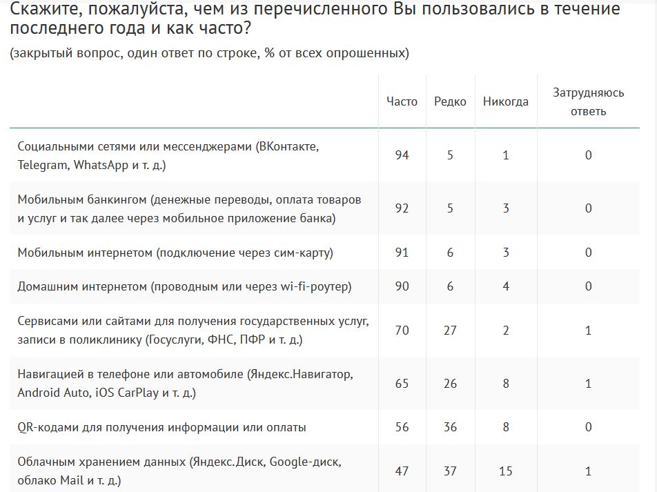 В среднем жители страны используют девять цифровых технологий или устройств в повседневной жизни. Больше всего — миллениалы (11), жители столиц и материально обеспеченные (10). Самые популярные технологии у россиян связаны с социальной и финансовой сферами. В топ-5 входят социальные сети или мессенджеры, мобильный банкинг, мобильный и домашний интернет, а также сервисы или сайты для получения государственных услуг. Реже всего россияне пользуются электромобилями, криптовалютным кошельком, каршерингом, телемедициной и игровыми приставками.
