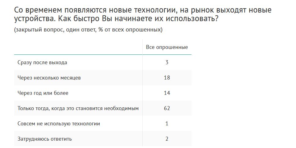Большая часть опрошенных интернет-пользователей (64%) ВЦИОМ отнес к вовлеченно-пассивной аудитории, которая начинает применять технологические новинки через год после их появления. Каждый десятый респондент (11%) относится к невовлеченно-пассивной аудитории — время принятия технологий составляет более года. Лишь 21% россиян технологически активны и используют новые продукты сразу после их выхода на рынок или в течение нескольких месяцев.