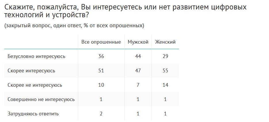 Жители России в целом воспринимают с интересом новые технологии, 36% безусловно интересуются, а 51% — скорее интересуются. Среди заинтересованных больше всего мужчин (44%), зумеров и младших миллениалов (43–45%), а также материально обеспеченных граждан (44%), свидетельствуют данные ВЦИОМ.