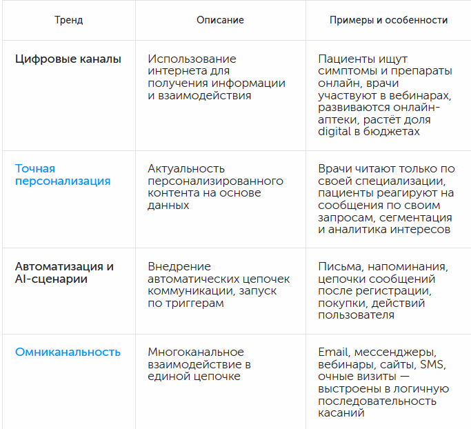 Кроме того, в фарме очень длинный клиентский путь от первого касания до финального решения: врач может узнать о препарате, но начать назначать его только через несколько месяцев. Или пациент увидит информацию, но решит попробовать только после консультации. Всё это требует доверия и регулярного, грамотного сопровождения.