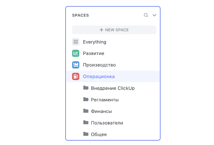 Создайте отдельное пространство (Space) под названием «Библиотека процессов». В нём будут находиться списки для каждой услуги вашего агентства или этапы работы над крупным проектом.