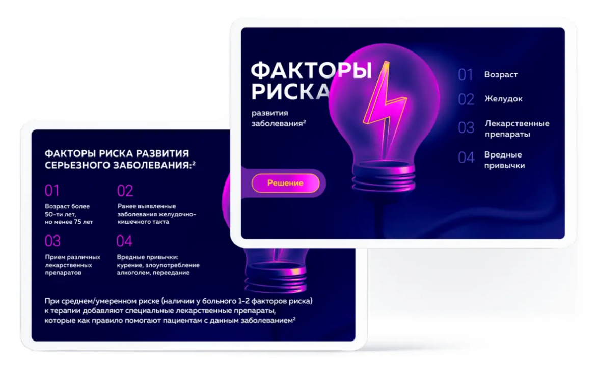 Креатив в eDetailing не всегда только про эмоции и образы — медицинские факты могут органично сочетаться с эмоциональными историями, усиливая друг друга. Например, обучающий блок для врачей-кардиологов о способах профилактики тромбоза при коронавирусе. Первый, актуализирующий слайд — это научная визуализация патогенеза развития заболевания. Но небольшая деталь в виде летящего в бездну человека, такого маленького по сравнению с процессами, бушующими в его организме, усиливает впечатление от контента.